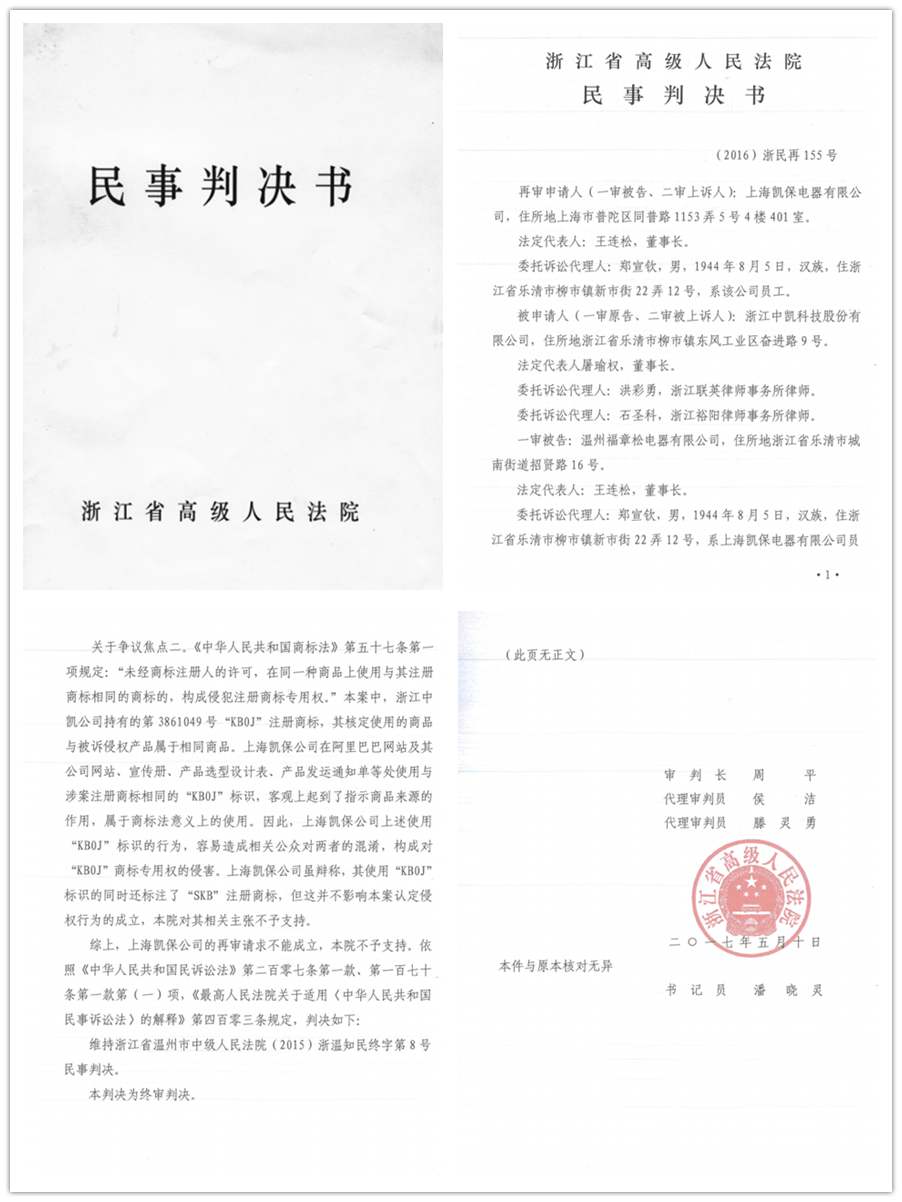 2017年5月10日,浙江省高級人民法院作出終審判決,中凱一場歷時三年的商標(biāo)維權(quán)案終于塵埃落定。本案得從2014年3月說起,因上海凱保長期蓄意侵害中凱商標(biāo)權(quán),在產(chǎn)品包裝盒、產(chǎn)品標(biāo)牌、企業(yè)官網(wǎng)、產(chǎn)品樣本、廣告等媒介平臺上大量使用與中凱KB0、KB0J、KB0D等商標(biāo)相似或近似字樣,并有意作一些誤導(dǎo)消費者的宣傳,被中凱訴至法院。樂清市法院受理此案后,通過大量的調(diào)查了解,以大量的事實證據(jù)為依據(jù),認(rèn)定上海凱保侵權(quán)事實成立,判令上海凱保停止侵權(quán),賠償損失。上海凱保不服,上訴到溫州市中院,溫州市中院通過對案件的審查,最終在充分的事實和證據(jù)基礎(chǔ)上作出了維持一審判決的二審判決。上海凱保為達(dá)到其不可告人的目的,使出一套“纏”和“拖”的絕技,對二審法院的判決仍然表示不服,向浙江省高院提出再審申請。省高院受理案件后,開庭再審該案,在大量的事實和證據(jù)面前,最終作出了維持溫州市中院二審判決的終審判決。這一判決,標(biāo)志著一些別有用心,惡意侵害或蓄意侵占中凱商標(biāo)權(quán)的不法行為的破滅。