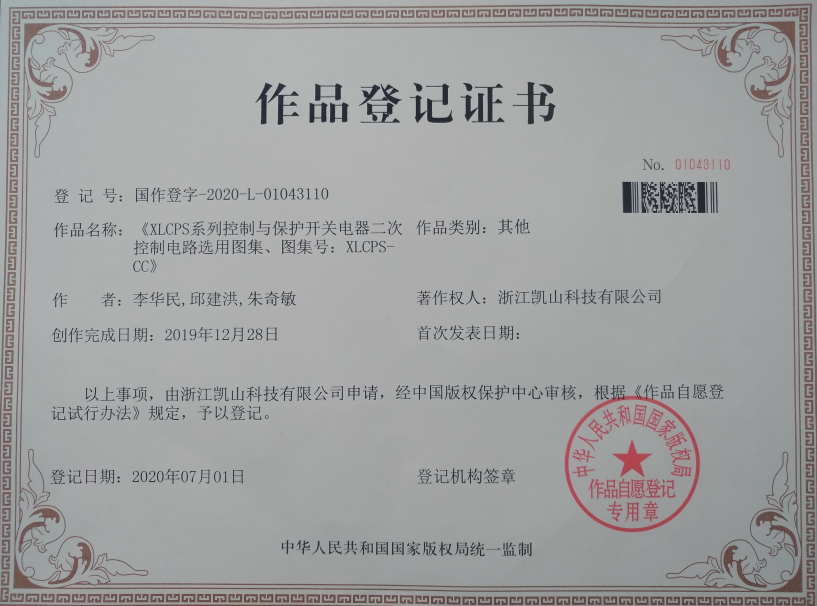 近日,國家版權局頒發作品登記證書,由浙江中凱科技股份有限公司全資子公司浙江凱山科技有限公司為著作權人的兩本在工程設計及應用中的標準設計圖集獲得作品登記。兩本圖集分別為《XLCPS系列控制與保護開關電器二次控制電路選用圖集》(圖集號XLCPS-CC)、《KSK系列控制與保護開關電器二次控制電路選用圖集》(圖集號KSK-CC)。