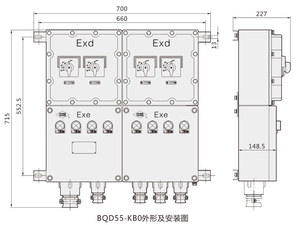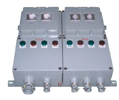 BQD55一KB0防爆控制與保護(hù)開關(guān)箱(以下簡稱開關(guān)箱)適用于ⅡB級(jí)T6組及以下級(jí)別、組別的爆炸性氣體混合物(1區(qū)和2區(qū))場所。主要用于交流50Hz(60Hz),額定電壓至400V,開關(guān)箱額定電流至180A,各分路的電流至45A的電路中,對(duì)配電電路負(fù)載的控制與保護(hù)及對(duì)電動(dòng)機(jī)不頻繁或頻繁起動(dòng)、停止的控制與保護(hù)。